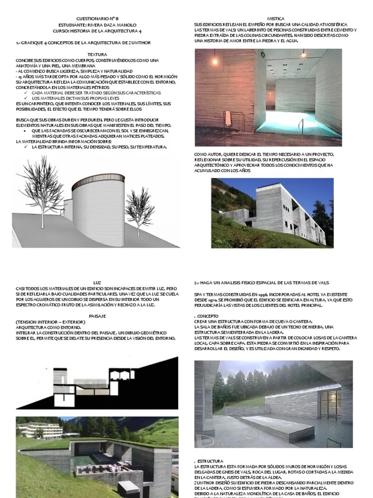Oct 22, 2021 · el arquitecto suizo se caracteriza por el equilibrio y la discreción de sus obras y por permitir, dentro de sus espacios, retomar una serie de nociones fundamentales, incluso, metafísicas. Para mí la realidad arquitectónica solo.. La estancia en las termas de vals, en suiza, es una experiencia completa para la mente y, …